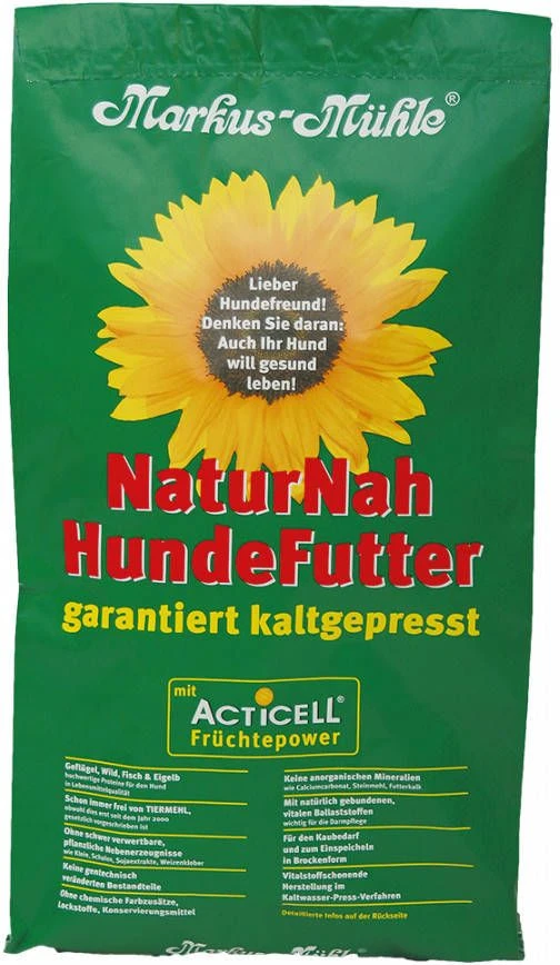 Het door de koude drukpers techniek bereide hondenvoer van Markus Natuur is een bijzonder hoogwaardige voeding voor elke hond, dankzij zijn bijzondere natuurlijke samenstelling. In Markus-Mühle voer zit kracht! Markus-Mühle Nature hondenvoer is ontwikkeld door mensen die dagelijks met honden te maken hebben en door honden zijn omgeven, want ook honden moeten gezond leven. Voor Markus-Mühle Natuur-voeding worden alle vaste ingrediënten tot meel gemalen. Daardoor wordt de biologische beschikbaarheid van de natuurlijke producten, het mengen en de vitale stof door een koude drukpers techniek optimaal verbeterd. Gevogelte, wild, vis en eieren van hoogwaardige levensmiddelkwaliteit met hoog eiwitgehalte ter verzorging van jouw hond Bevat natuurlijke en vitale voedingsstoffen ter bevordering van de darmflora De unieke kouddrukpers techniek zorgt voor een behoedzame bereiding Brokjes voor het verzadigen van de kauwdrang Vrij van lastig verteerbare, plantaardige producten zemelen, schalen, sojaextracten en tarwegluten. Zonder gebruik van genetisch gemodificeerde ingrediënten. Zonder chemische kleurstoffen, lokstoffen, conserveringsmiddelen Geen anorganische mineralen zoals calciumcarbonaat, steenmeel of poederkalk De specialisten van Markus-Mühle hebben altijd anders dan andere merken gedacht. Zo biedt Markus-Mühle enkel voer uit de natuur aan. Hun nieuwste ontdekking: anticell-vruchtenenergie voor de gezondheid van de cellen! Het is een unieke combinatie van verscheidene vruchten, die allen een hoog aandeel aan secundaire plantaardige stoffen bezitten. Deze plantaardige stoffen zijn antioxidanten en gaan daarom celveroudering actief tegen. Anticell heeft verschillende functies: bevordering van het immuunsysteem, optimalisatie van de verwerking van het voer en de ondersteuning van de spijsvertering. De specialisten hebben tien soorten vruchten (waaronder appel, bosbes, ananas en mango) uitgekozen en hieruit een combinatie van natuurlijke vitaalstoffen gemaakt. De mix bevat veel energie die de cellen kunnen gebruiken en zorgt er tegelijkertijd voor dat jouw hond met genoeg natuurlijke vitaminen en secundaire plantaardige stoffen wordt verzorgd: West Indische kersen: bezit een hoog vitamine C gehalte, ter ondersteuning van het immuunsysteem. Appels: bevat een hoog pectine gehalte, dat een belangrijke voedingsstof ter bevordering van de darmflora is. Bananen: met belangrijke mineralen, koolhydraten, vitamines, voedingsvezels en veel calcium. Dit alles is belangrijk voor het binnenkrijgen van genoeg energie, en ter bevordering van de zenuw- en spieractiviteit evenals de activering van enzymen. Peren: door een verhoogd mineraalgehalte wordt de darmflora bevorderd. Frambozen: met biotine, ter ondersteuning van de huid-, vacht- en klauwgroei. Bosbessen: bevatten veel fenolische zuren, flavonoïden en andere secundaire plantaardige stoffen die bijzonder belangrijk zijn voor de gezondheid van de kleine bloedvaten en het zicht. Sint-Jansbrood: beschikt over antioxidantische eigenschappen door het erinverwerkte gallisch zuur, flavonoïden en glycosiden. Hierdoor bevordert het de spijsvertering. Mangos: heeft een positief effect op de pigmentering van het vacht. Antioxidanten als secundaire plantaardige stoffen aanwezig ter ondersteuning van het immuunsysteem. Papayas: met belangrijke enzymen waaronder papaïne ter ondersteuning van de eiwitvertering. Daarnaast staat de papaya bekend om zijn bevorderende werking van de spijsvertering. Duizenden jaren geleden is de hond als prooigrijper ontwikkeld. Dit betekent dat hij bessen, vissen, insecten en kruiden at, maar voornamelijk verschillende prooidieren. Niet alleen het vlees van de dieren werden gegeten, maar ook ingewanden, botten, pens, lichaamssappen, vacht etc. Alles om gezond te blijven werd is de prooi gevonden. Tegenwoordig wordt dit vaak vergeten. De beste voeding voor honden blijft na al die jaren nog steeds kleine proodieren. Natuurlijk kan met niet alle honden natuurlijke prooi geven. Het idee van dit eigenaardige hondenvoer kwam van een bekende dierenarts, die tevens een hondenpension bezat en een fokker was. Het resultaat: Markus-Mühle Natuur hondenvoer. Wetenschappelijke analyses bevstigen dat Markus-Mühle voer rijk is aan mineralen en een evenwichtige amino-zuurgraad heeft die de optimale basis voor een hondenvoer vormen. Het voer wordt in een familiebedrijf in Westerwald geproduceerd met een speciaal koude drukpers techniek. De brokken van Markus-Mühle voer schoont de tanden en bevredigd de behoefte om te kauwen. Bij de vervaardiging van deze unieke hondenvoer wordt consequent afgezien van: rundvlees, varkensvlees, conserveringsmiddelen, chemische kleurstoffen, plantaardige eiwit extracten, kunstmatige aroma- en lokstoffen, genetisch gemodificeerde ingrediënten en anorganische mineralen. Let op: Bij de productie van Markus Mühle hondenvoer worden geen chemische kleurstoffen, lokstoffen, conserveringsmiddelen en gentechnisch gemodificeerde bestanddelen toegevoegd. De korte houdbaarheid van droogvoer Markus Mühle van 6 maanden vanaf de productiedatum is hiervan een bewijs.