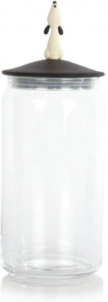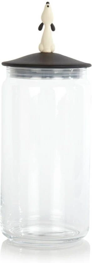 Alessi hondenvoederbewaarpot Lulà Jar met deksel, in thermoplastische hars en glas. De deksl is afgewerkt met een zittend hondje.