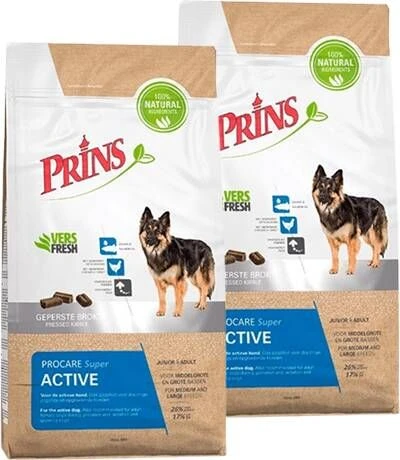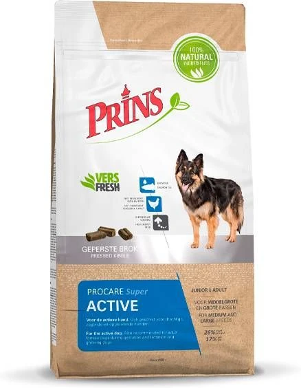 Prins ProCare Super Active Hondenvoer ProCare Super Active is een hoogwaardige voeding speciaal voor opgroeiende en actieve honden die in de kracht van hun leven zijn.